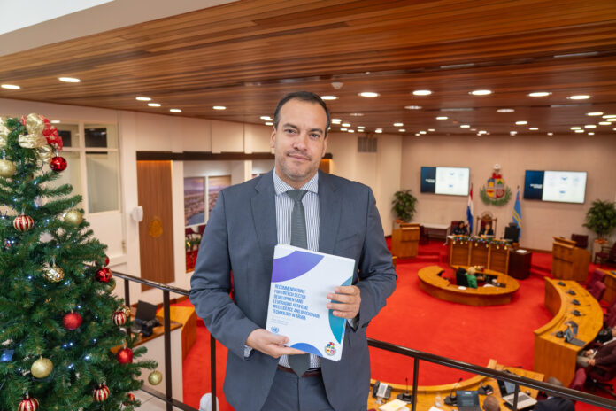 Diamars 25 november 2025, Minister Geoffrey Wever hunto cu UN-ECLAC, representa door di sr. Dale Alexander y sr. Kwesi Prescod, a presenta e resultado di e estudio na Parlamento di Aruba y a haci entrega na Parlamento di Aruba di e 4 rapportnan. En corto un resumen di accionnan cu UN-ECLAC a sugeri cu por accelera progreso durante e presentacion na Parlamento: