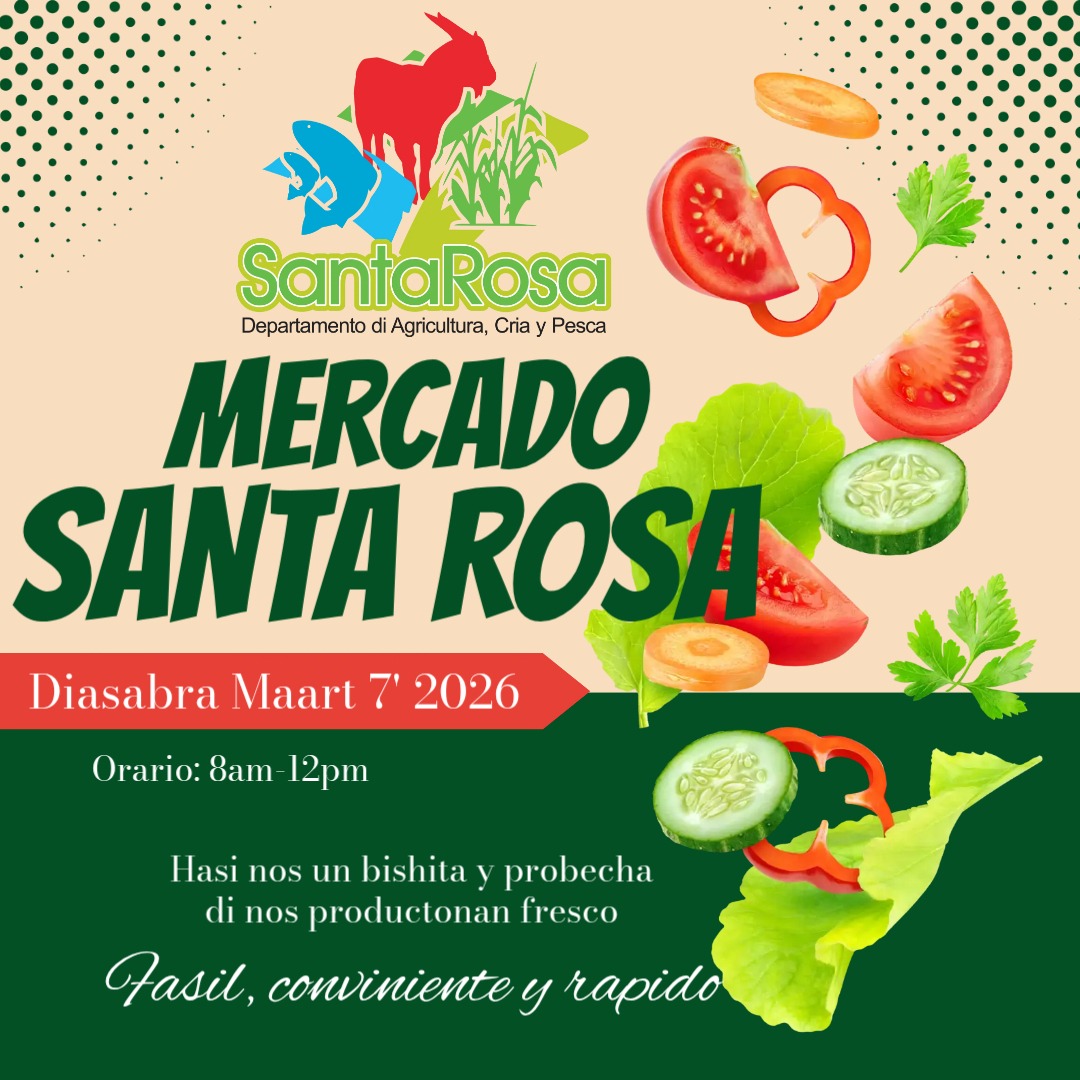 Awor nos ta contentoa pa anuncia cu e Mercado di Santa Rosa lo tuma lugar semanal, enbes di mensual. Pueblo por disfruta di cumpra varios producto fresco y local, aportando na e economia local di Aruba, y tambe na e cunukero y agricultornan di nos isla. E mercado aki lo tuma lugar 3 siman na Santa Rosa y un siman na Pplaza Llolita den e centro di San Nicolas como parti di e Pop-up Market.