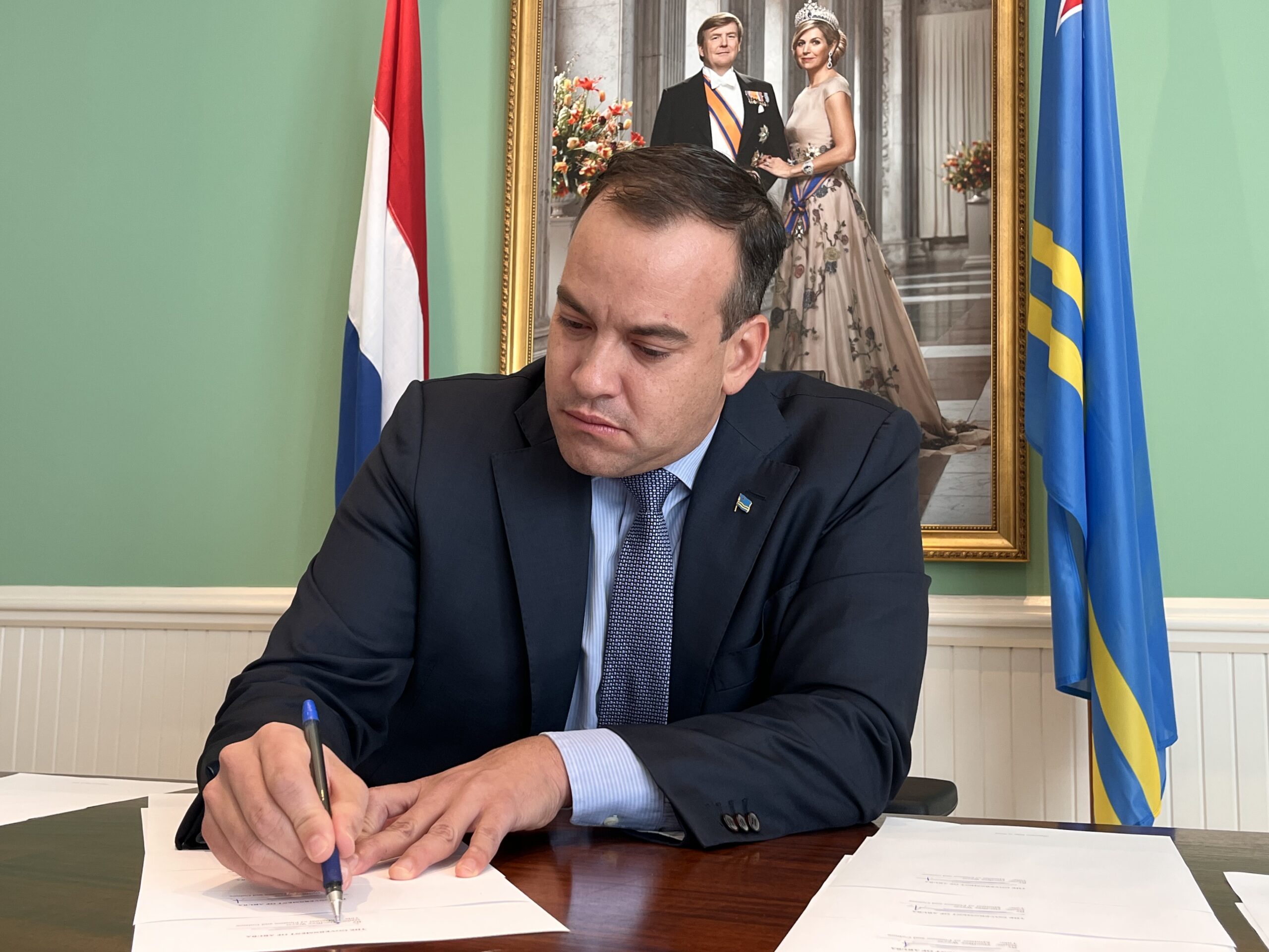 inister di Finansa, Asunto Economico y Sector Primario, mr. Geoffrey Wever, a firma e Landsbesluit cu ta finalisa y formalisa e prestamo cu Gobierno di Aruba a coloca riba mercado di capital internacional. E prestamo di USD 140 miyon ta destina pa refinancia debenan di pasado y pa garantisa cu Pais Aruba por cumpli cu tur su obligacionnan financiero den e luna di december.