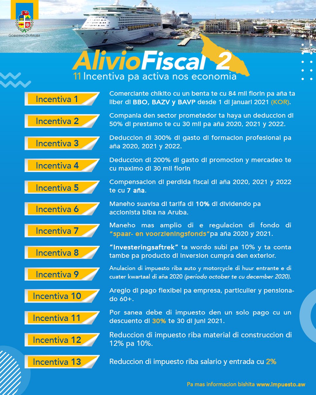 ORANJESTAD – Aña pasa na luna di april despues cu Covid 19 a azota nos pais, Gobierno di Aruba pa medio di Minister di Finansa, Asuntonan Economico y Cultura Sra. Xiomara Maduro a tuma e prome pasonan y a anuncia Alivio Fiscal 1 pa asina brinda un flexibilisacion fiscal na e companianan cu mas a wordo afecta pa crisis cu Covid19 a ocasiona. Pa e lunanan di april, mei y juni 2020 a hiba un maneho fiscal mas flexibel pa cu pago, areglo di pago, boet y control. E mandatario hunto cu su departamentonan y conseheronan a sigui traha duro riba proposicionnan di incentivanan fiscal y na luna di november 2020 a anuncia e pakete di Alivio Fiscal 2 cu a consisti di 11 incentiva pa trece alivio na nos comercio y e pueblo en general cu e meta pa reactiva y stimula economia di nos pais Aruba. Na luna di december 2020 e mandatario anuncia dos incentiva mas, pa asina por completa 13 incentiva di Alivio Fiscal 2.
