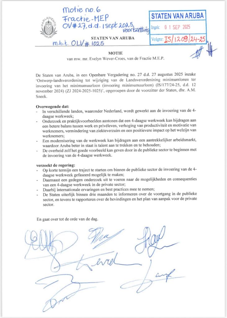 Durante e tratamento di e ley di aumento di sueldo minimo, lider di MEP, Evelyn Wever-Croes a entrega un mocion pa cambia e siman di trabou di 5 dia, pa 4 dia. Esaki tabata un punto importante den MEP su campaña electoral, y henter Parlamento a aproba e mocion.