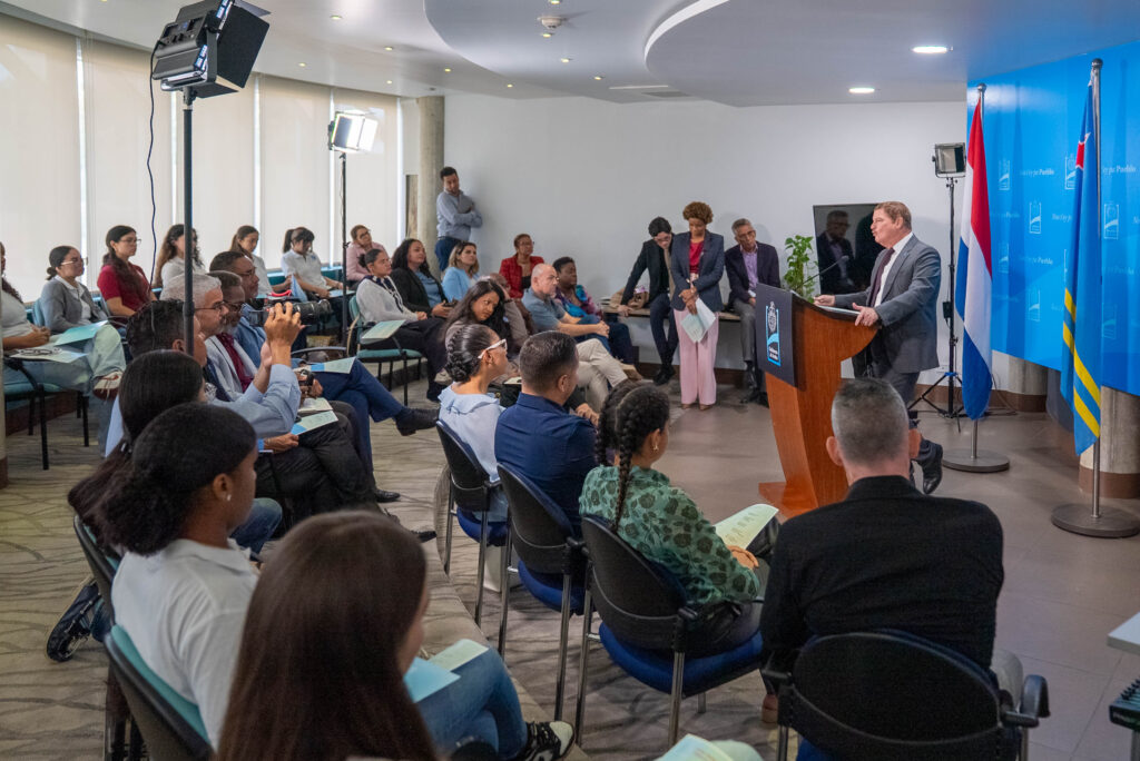 Den sala di conferencia, Prome Minister Mike Eman a ricibi bishita di studiantenan di Mon Plaisir College, kende a presenta nan idea riba e tema di “Common Good” (Bon Comun).
