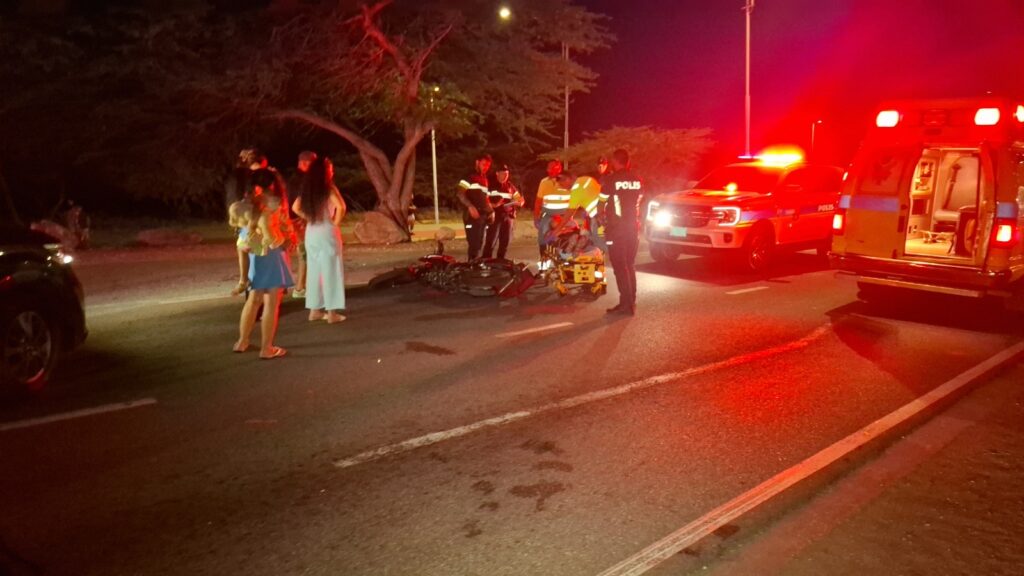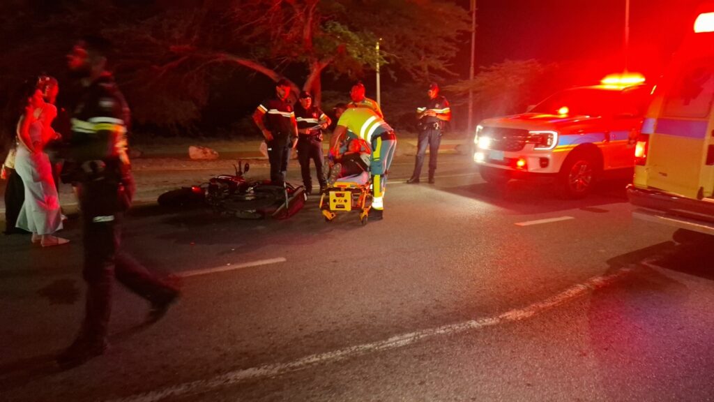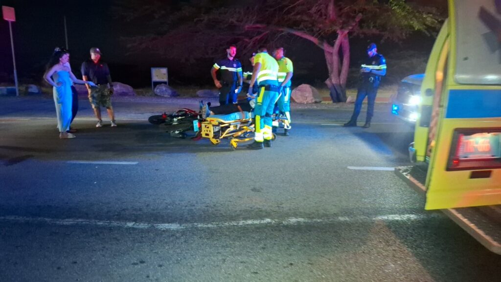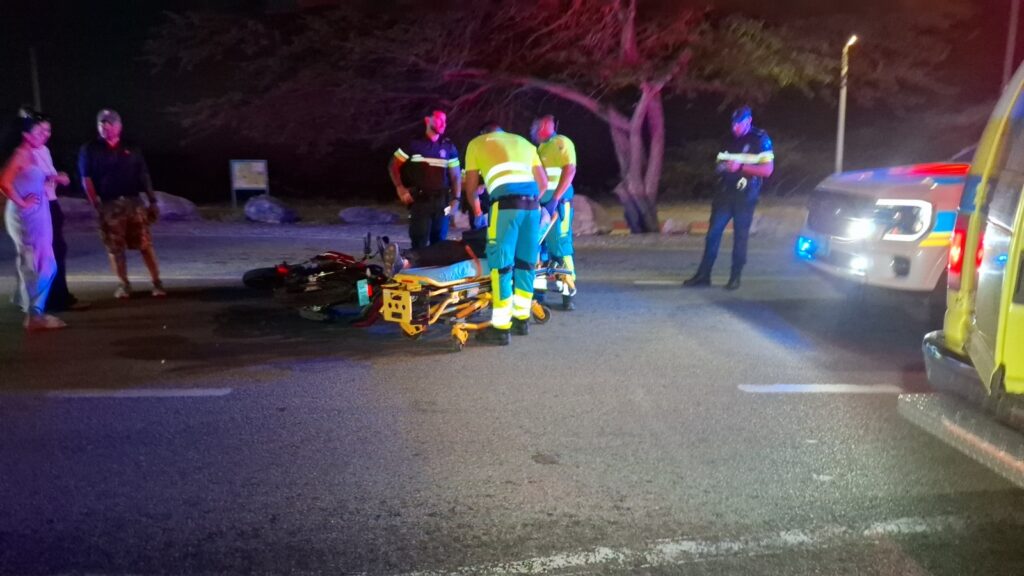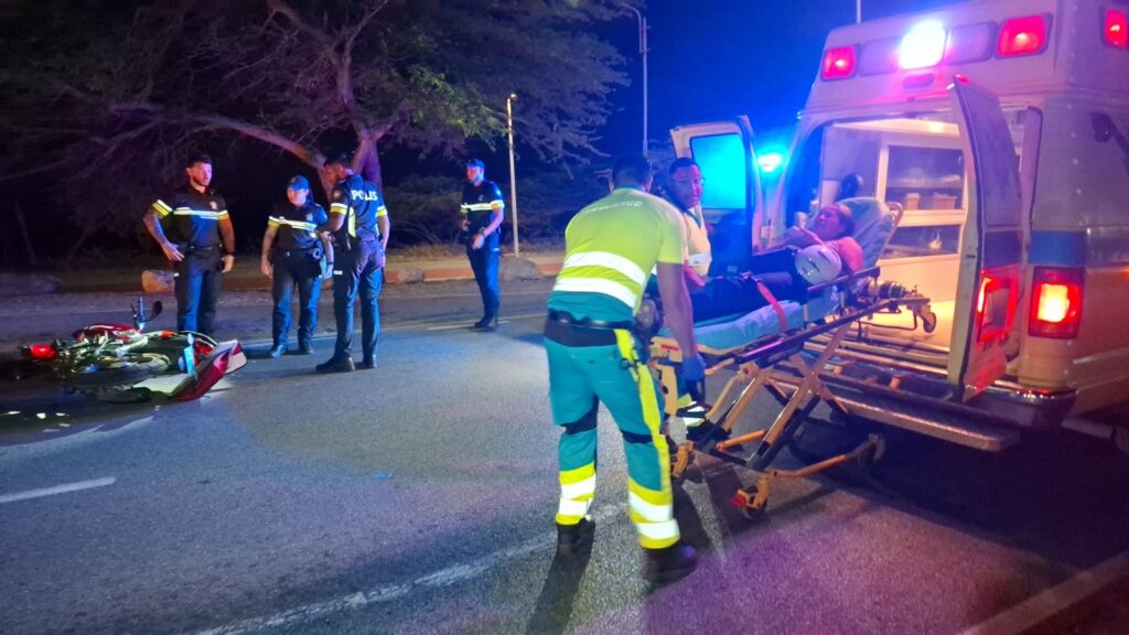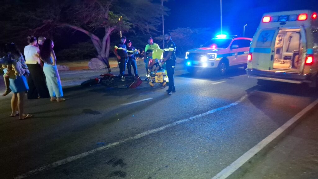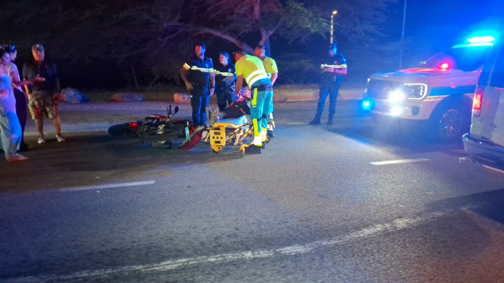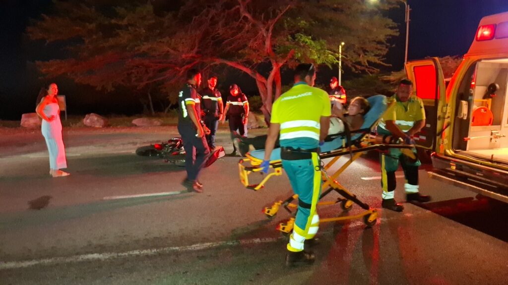 Diahuebs anochi a drenta informe di un accidente cu hende herida dilanti di Blue Residences, mesora a dirigi tanto polis como ambulans na e sitio. Na yegada di e patruya a bin compronde cu aki ta trata di un motociclista femenino cu mester a hala pa un auto y pa no dal e bus di direccion contrario a hala mas na e auto di huur cu a subi caminda y a bay dal riba e auto den banda rascando esaki. Den e esey e motociclista a dal abao y a resulta herida. Na yegada di e ambulans nan a atende e dama y a transporte pa hospital.