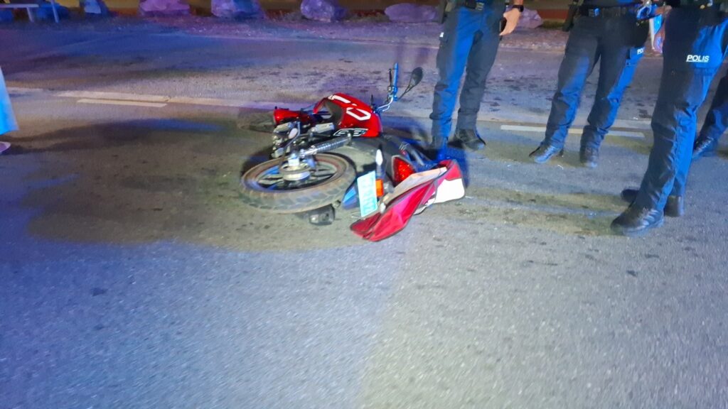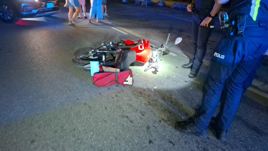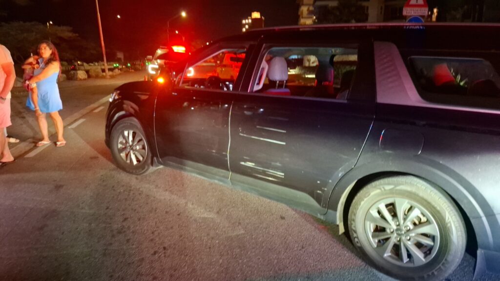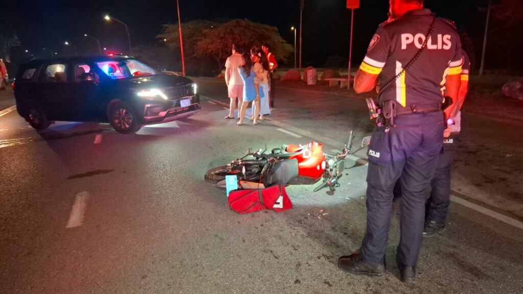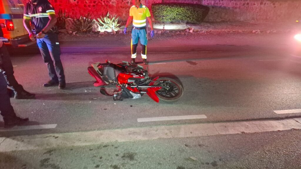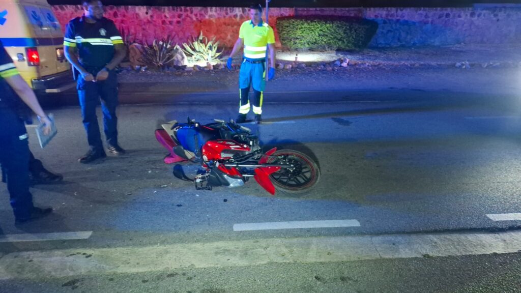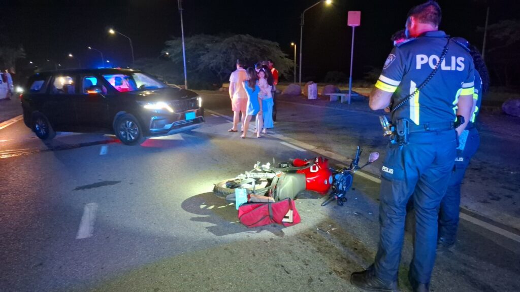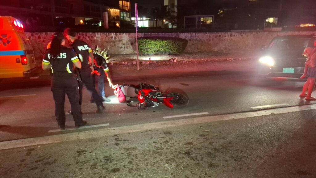 Diahuebs anochi a drenta informe di un accidente cu hende herida dilanti di Blue Residences, mesora a dirigi tanto polis como ambulans na e sitio. Na yegada di e patruya a bin compronde cu aki ta trata di un motociclista femenino cu mester a hala pa un auto y pa no dal e bus di direccion contrario a hala mas na e auto di huur cu a subi caminda y a bay dal riba e auto den banda rascando esaki. Den e esey e motociclista a dal abao y a resulta herida. Na yegada di e ambulans nan a atende e dama y a transporte pa hospital.