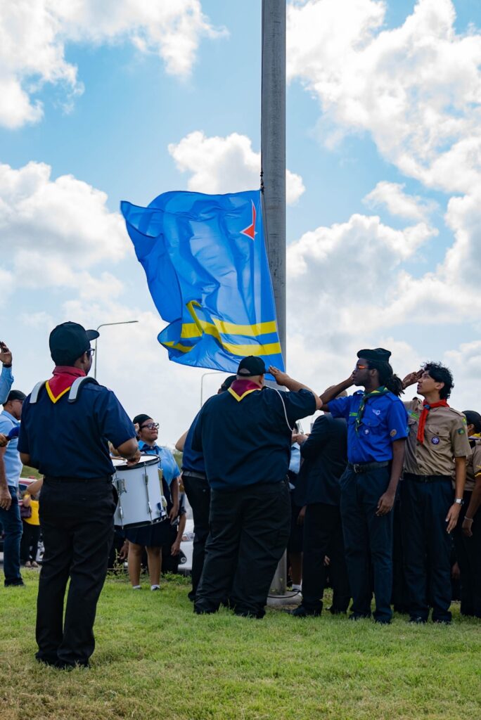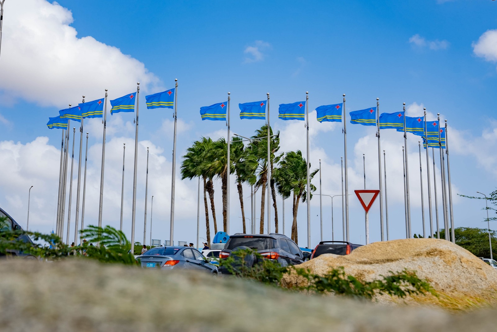 Parlamento di Aruba a aproba e diseño riba 16 di maart 1976 cu a bira e bandera oficial di Aruba. Esaki a keda inaugura riba 18 di maart 1976. Pa prome biaha a hisa e bandera y a toca e cantica “Aruba Dushi Tera” como nos himno nacional di Aruba durante un celebracion grandi den Wilhelmina Stadion, na Dakota. Awe Compleho Deportivo Guillermo Prospero Trinidad.