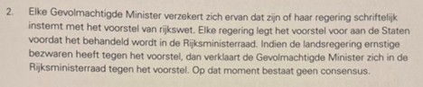 Raad van State a duna un conseho den cuadro di funciamento di 70 aña Statuut den Reino Hulandes. Ora nan a trata e tema di consensusrijkswet nan a conseha e procedura cu un gevolmachtigde minister mester sigui prome cu presenta cualkier proposicion di un rijkswet na conseho di minister di reino.