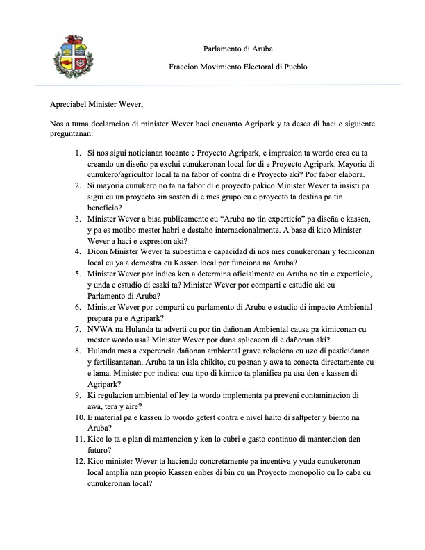 Nos a tuma nota cu minister Wever a anuncia recientemente cu e mester bay cambia e destaho publico di e diseño di e Proyecto Agripark y haci esaki uno internacional pasobra localmente ningun compania por haci esaki. Nos a keda masha asombra cu e anuncio aki y a base di esaki nos a dirigi varios preguntanan na minister Geoffrey Wever. Nos a papia cu varios cunukero y nan a expresa nan desapunte y preocupacion pa e plannan di minister Wever. Nan ta sinti cu esaki ta un setup pa laga inversionistanan di afor bin tuma over y dicta riba tur cunukero local.