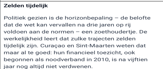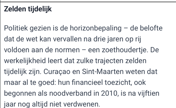 Mas tristo di e rijkswet HOFA aki ta e hecho cu NUNCA mas pais Aruba lo sali for di dje! Nos a bisa semper cu e forma con Hulanda a trata Aruba no ta uno husto ni igual. Dia Corsou y Sint Maarten a haya nan Status Aparte e condicion tawata cu mester acepta e rijkwet. A cambio Hulanda a paga TUR nan debenan y aki na Aruba kier condiciona HOFA pa un reduccion di interes di 5.4% pa 3.4%. Lesa pa boso mes si e rijkswet na Corsou y Sint Maarten tawata temporal y a funciona manera a ser priminti!