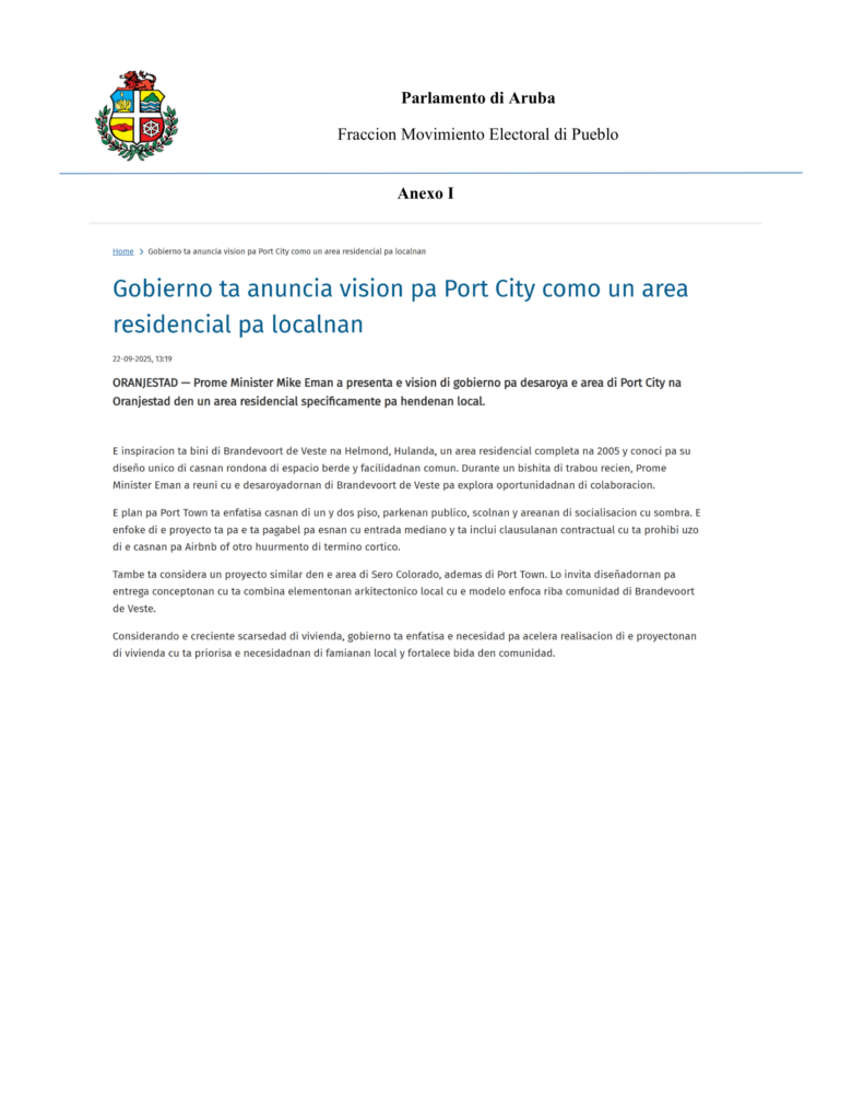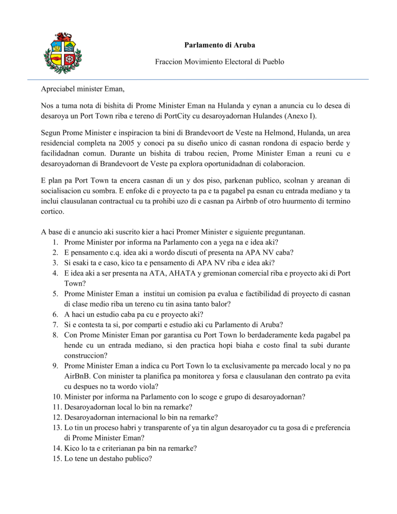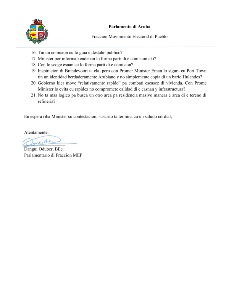 Despues di e anuncio reciente di Prome Minister Mike Eman tocante su vision pa desaroya un “Port Town” riba e tereno di Port City, Parlamentario Dangui Oduber a presenta un serie di preguntanan na Parlamento pa busca claridad riba e plan aki.