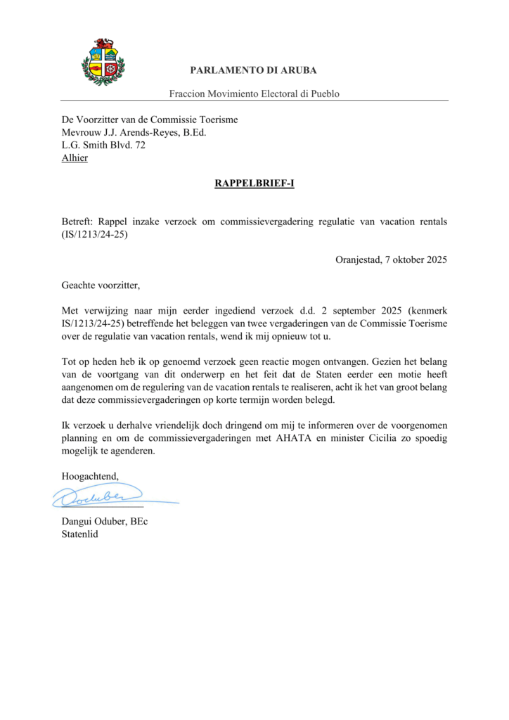 Miembro di Parlamento sr. Dangui Oduber, a bolbe entrega dos peticion formal na Presidente di Parlamento sr. Sneek y Presidente di comision di turismo, sra. Arends-Reyes. E peticionnan ta pa yama reunionnan di comision cu AHATA y cu Minister di Turismo, sr. Cicilia, pa brinda atencion urgente riba e situacion y falta di regulacion di vacation rentals na Aruba.