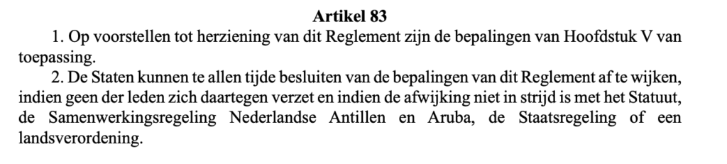 Dia 19 di November 2025 a trata den comision central e ley conoci como LIM (landsverodening instelling ministers). Un ley importante cu a haya un dictum 4 cu ta un onvoldoende. Den e reunion aki ta custumber cu ta bin hunto y ta fiha fecha pa haci pregunta cu despues ta ser hinca den un documento cu nos ta yama verslag (un compilacion di preguntanan) y cu mester bin sala bek den un CC pa leg esakinan vast y pa despues nan bay pa Gobierno pa nan contesta e preguntanan. E derecho di haci pregunta ta ancra den nos Constitucion y nos Reglamento di Ordo di Parlamento. Na e momento ey sra Muzanin Wever tabata fungi como Presidente den ausencia di sr Marlon Sneek. Su persona a bin c’un proposicion pa haci e verslag blanco, pues pa no haci uzo di bo derecho di haci pregunta. Esaki ta un desviacion y conforme articulo 83 inciso 3 di Reglamento di Ordo tur miembro mester ta di acuerdo. Pues si un miembro no ta di acuerdo, mester fiha fecha pa entrega di pregunta. Den e caso aki sra Muzanin Wever a dicidi di trapa Constitucion y no sigui Reglamento di Ordo di Parlamento y ta conclui cu e desicion pa haci’e blanco por bay cu mayoria esta fraccion di AVP/ FUTURO y PPA. Esaki no ta cuadra cu e berdad! E desicion tuma tabata uno contra Reglamento di Ordo y ta trapa derecho constitucional di cada Parlamentario pa haci pregunta.