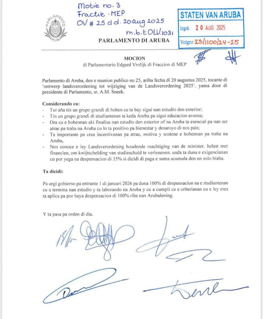Durante tratamento di presupuesto supletorio siman pasa, Fraccion di MEP a presenta un mocion pa duna studiantenan “kwijtschelding”, dispensacion di nan Arubalening. Pues si nan bin Aruba bek pa traha, nan no mester paga e Arubalening bek. Esaki lo a conta pa studiantenan cu bay studia den exterior y pa esnan cu ta studia na Aruba. Awor cu tin surplus, y a crea espacio financiero, fraccion di MEP ta considera esaki un estimulo pa trece nos hobennan bek, of tene nan aki. Mirando cu falta hende pa traha na Aruba, awor ta e momento apropia.