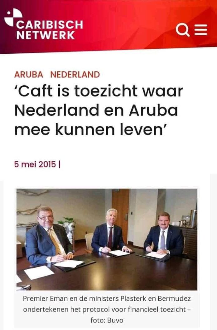 E tempo ey Hulanda a exigi pa e supervision financiero bai den forma di un rijkswet. Pero e prome minister di e tempo ey a roga nan pa no haci esey, pa lage den un landsverordening (un ley local), y a priminti nan cielo y tera. Entre otro el’a priminti cu e lo mantene su mes na e normanan financiero den e ley.Esnan cu a firma e acuerdo e tempo ey tabata ex minister Plasterk di Hulanda, y pa Aruba, ex Minister Mike Eman (AVP) y ex Minister Angel Bermudez (fundado di Futuro).