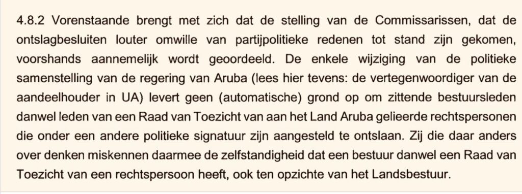 Ademas hues ta bisa cu “de enkele wijziging van de politieke samenstelling van de regering van Aruba, levert geen (automatische) grond op om zittende bestuursleden danwel leden van een Raad van Toezicht … die onder een andere politieke signatuur zijn aangesteld, te ontslaan”.