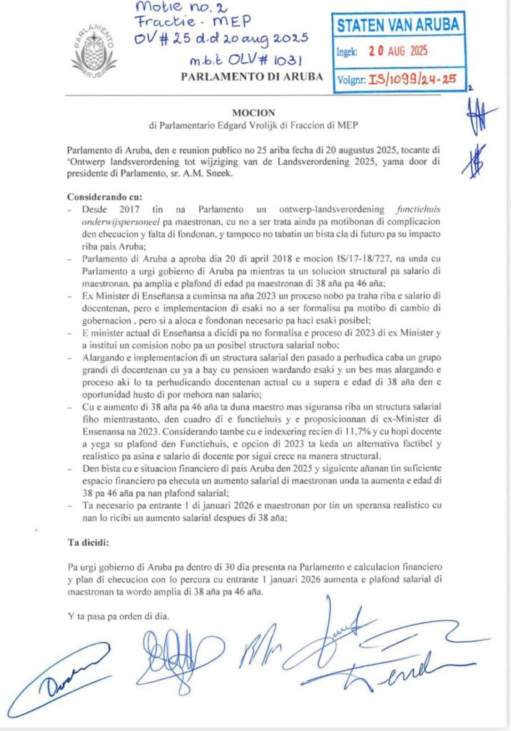 Lamentablemente e mayoria di parlamentarionan di AVP y Futuro a vota contra tur e mocionan. Un di nan tabata pa hisa e plafond salarial di edad di maestronan di 38 pa 46 aña prome cu fin di 2025. E mocion aki lo a yuda 90% di e veld pa haña un aumento mesora, awor cu tin surplus.