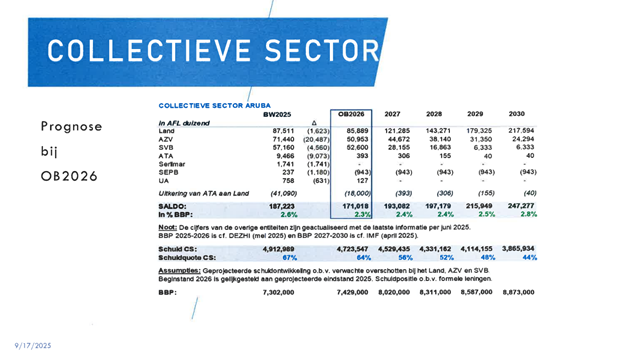 E presentacion y e cifranan presenta ta mustra claramente cu despues di COVID Aruba a recupera fuerte. For di aña 2022 nos debe a cuminsa baha y for di 2023 nos tin atrobe surplusnan structural. Segun e proyecionnan ricibi, te cu 2030, si sigui cu e maneho responsabel, lo sigui tin surplusnan sigur y nos debe lo sigui baha.