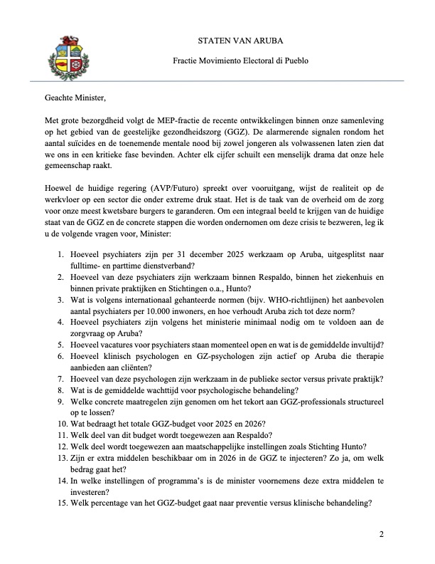 “Nos ta keda papia di Salud Mental riba podcast y programanan, pero gobierno tin cifras, plan y placa pa inverti pero no tin accion. Nos comunidad merece transparencia y boluntad di e titular encarga”, Tevreden ta indica.