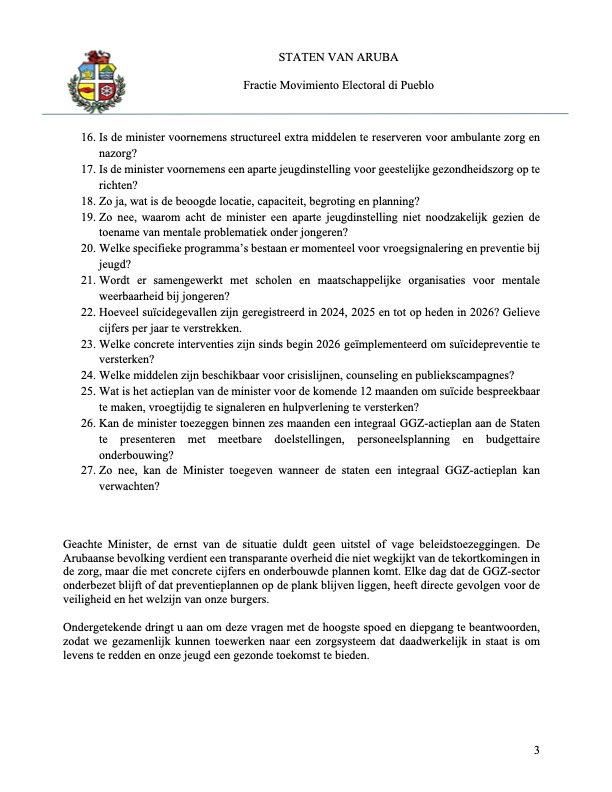 Parlamentario Tevreden oficialmente a manda un serie di pregunta oficial na minister Wyatt Ras den su rol como titular di Salubridad Publico. E situacion ta alarmante, abnormal y spantoso na Aruba. Nunca antes nos a conoce un habrimento di aña cu tanto sucedido.