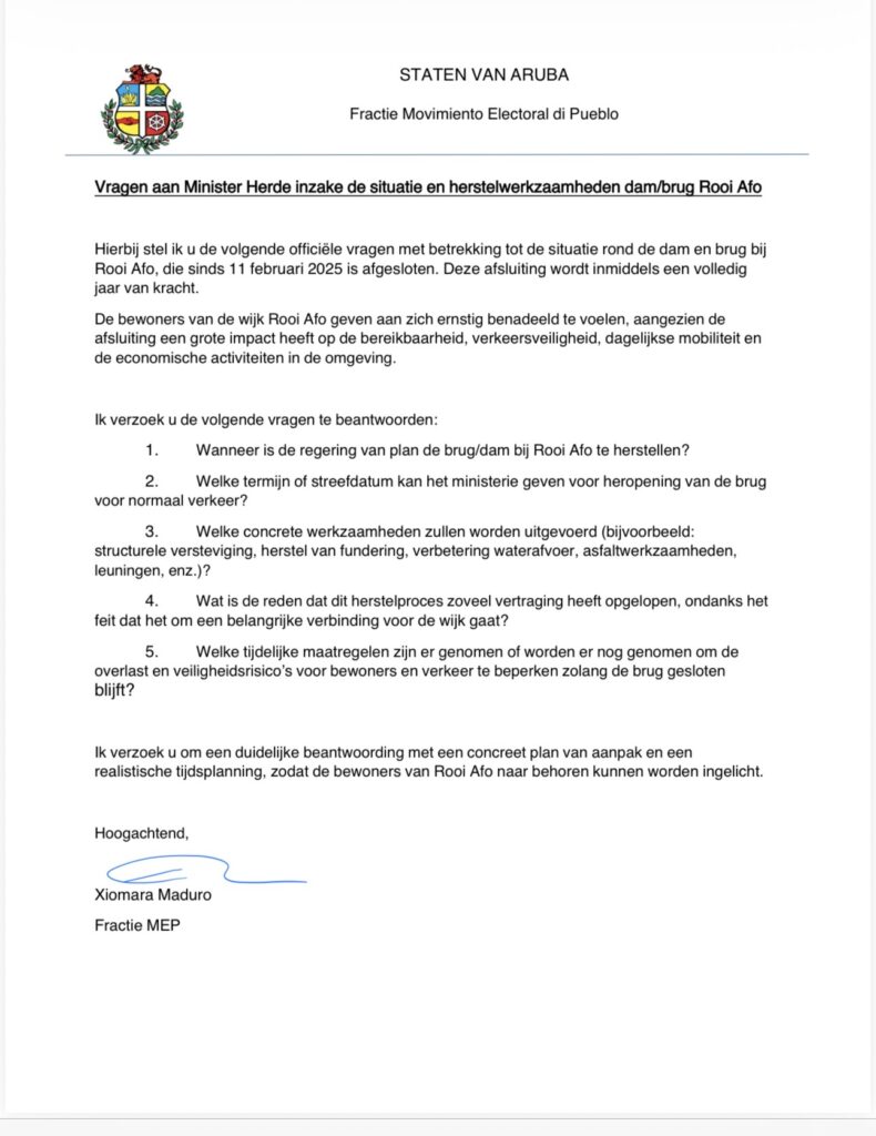 Dia 11 di februari 2026 ta cumpli exactamente un aña cu e brug di Rooi Afo ta cera pa trafico. Desde 11 februari 2025, e caminda riba e dam di Rooi Afo ta cera, y te cu awe, e bisiñanan y usuarionan no a ricibi ningun informacion ki dia e trabounan di reparacion lo cuminsa y ki dia e brug lo habri bek.