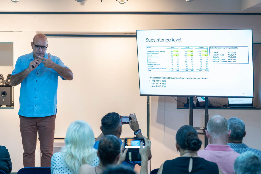 Un punto cu a haya atencion tabata e situacion serio di vivienda na Aruba. Segun Sr. Koolman, aproximadamente 60% di pueblo no por cumpra of yega na un cas actualmente, un reto cu ta crea presion social y financiero pa largo plaso. Tambe e la referi na e desafio di “bestaansminimum”, indicando cu Aruba mester mantene un nivel minimo di capasidad economico y demografico pa sostene su economia y servicio nan publico a largo plaso.