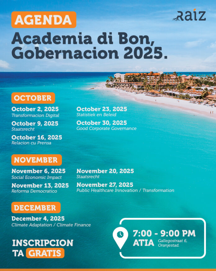 Partido RAIZ ta orguyoso di unabes mas trece Academia di Bon Gobernacion (ABG) pa e comunidad di Aruba. Iniciando dia 2 di october te cu 4 di december 2025, ABG lo presenta un total di 10 session riba diferente topiconan, presenta pa expertonan den nos comunidad. Participacion den ABG ta pa esnan cu kier compronde kico ta encera ‘Bon Gobernacion’ sin importanta color politico y sin cualkier compromiso na Partido RAIZ. Participacion ta pa personan di 18 aña of mas y ta completamente gratis.