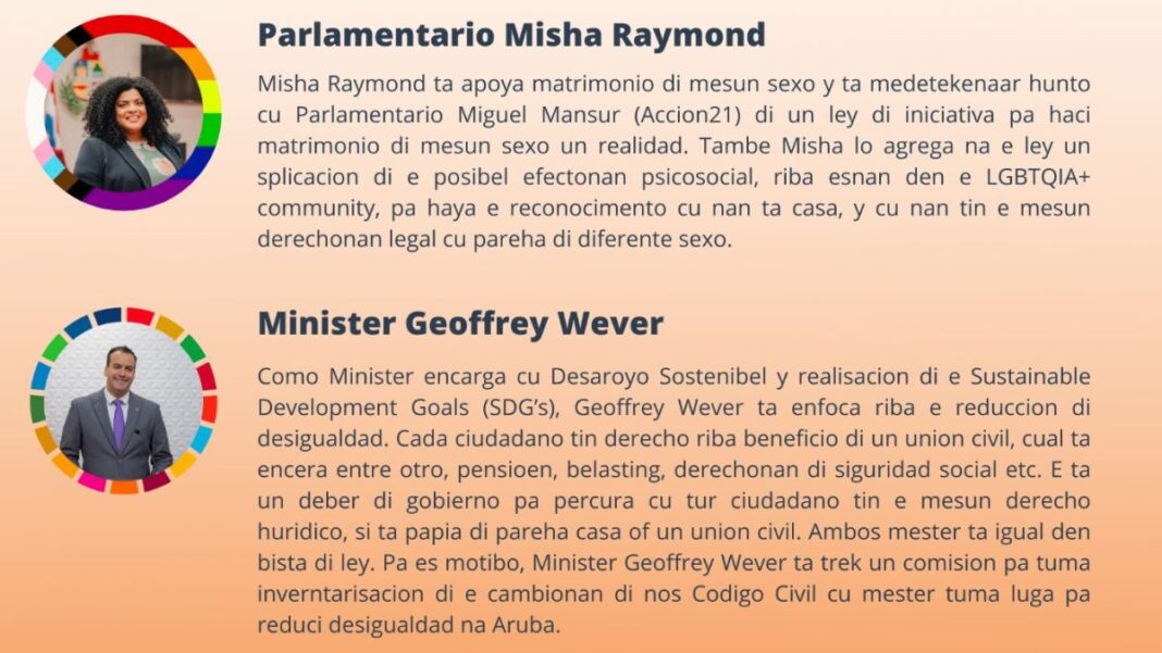 Misha Raymond ta apoya matrimonio di mesun sexo y ta medetekenaar hunto cu Parlamentario Miguel Mansur di un ley di iniciativa pa haci esaki un realidad. Tambe Misha lo agrega na e ley un splicacion di e posibel efectonan psicosocial, riba esnan den e comunidad LGBTQIA+ pa haya e reconocimento cu nan ta casa, y cu nan tin e mesun derechonan legal cu pareha di diferente sexo.