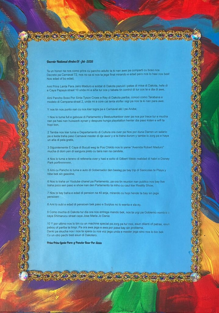 Diadomingo 1 di februari, Carnaval 72 a ranca sali oficialmente, despues cu Prome Minister Mike Eman a ricibi e monarcanan di Carnaval 2026 na Bestuurskantoor, y a tuma luga e tradicional traspaso di mando. Durante e ceremonia simbolico, Prome Minister a entrega e yabi di Carnaval, pa duna asina e monarcanan e mandato pa dirigi, tuma rienda y guia e celebracion cultural mas grandi di Aruba.