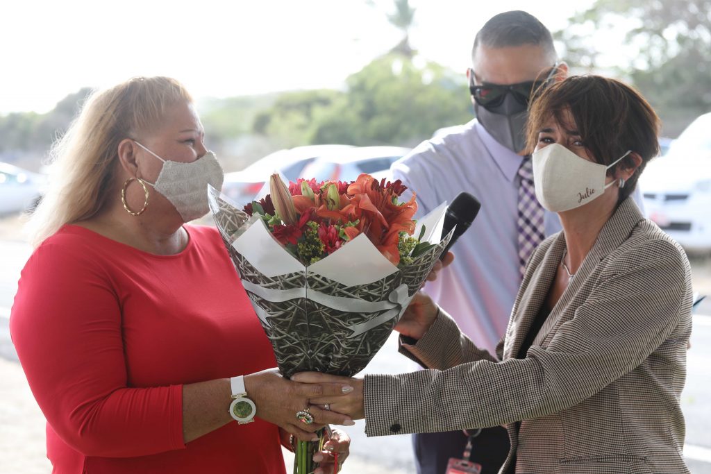 Prome Minister Evelyn Wever – Croes na entregamento di e yabi a expresa: “Ta un momento sumamente importante ya cu entregando di e yabi aki, mi lo contribui na felicidad di un persona y su famia. E persona aki ta señora Trina Irausquin. Señora Trina tin 56 aña di edad y a nace na Aruba. Na Señora Trina lo mi kier desea hopi placer cu su cas nobo.’