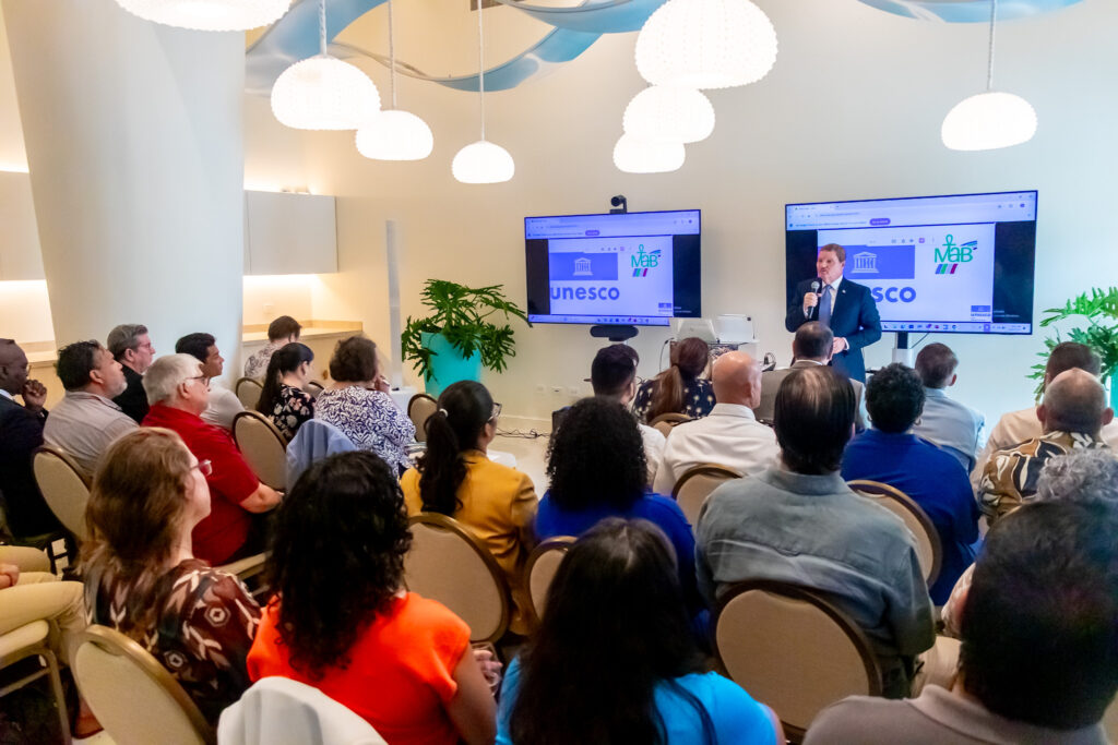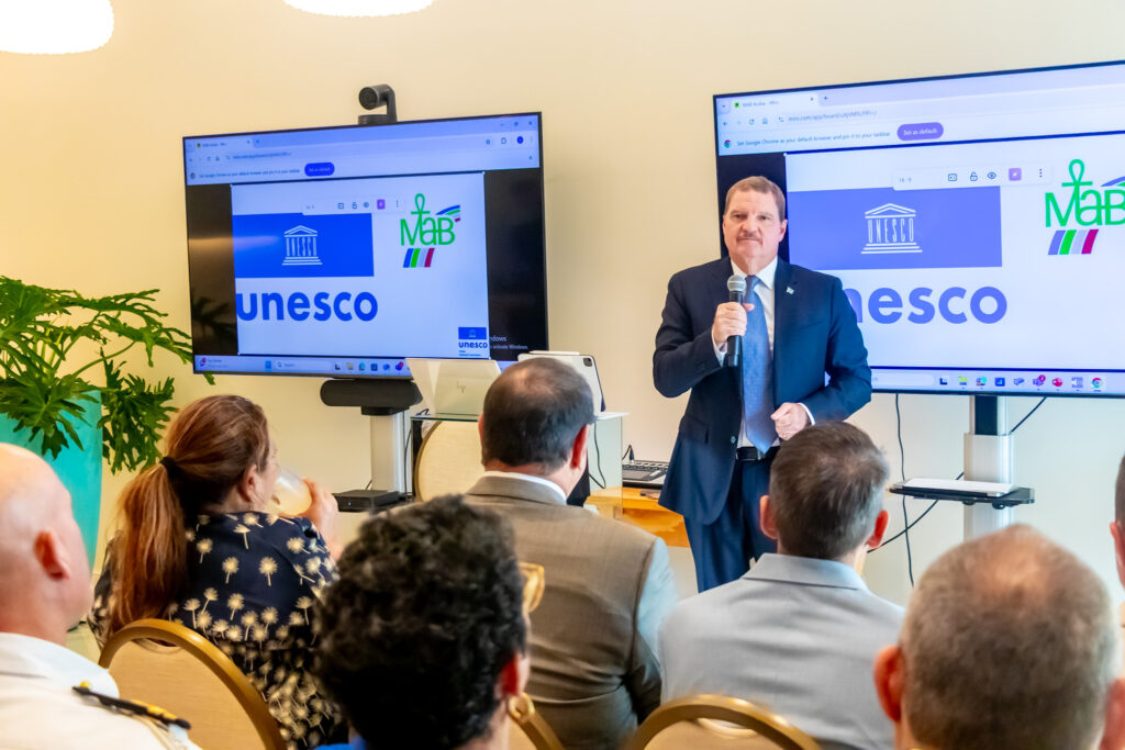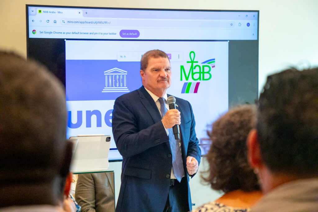 Den presencia di Su Excelencia Gobernador Alfonso Boekhoudt y un grupo grandi di stakeholders, UNESCO a organisa un “Training Workshop for the co-construction of a biosphere reserve in Aruba”, na JOIA Aruba by Iberostar. A habri e sesion cu un discurso optimista di Prome Minister mr. Mike Eman, cu a subraya su vision pa un Aruba cu ta uni crecemento economico cu proteccion di naturalesa.