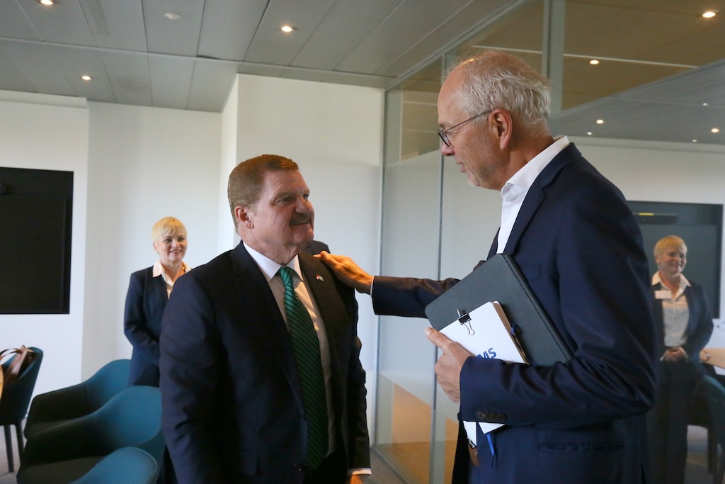 Diaranson mainta, Prome Minister di Aruba, mr. Mike Eman, a sostene un encuentro importante na Hulanda cu e ehecutivo mas halto di Royal Schiphol Group, sr. Pieter van Oord.