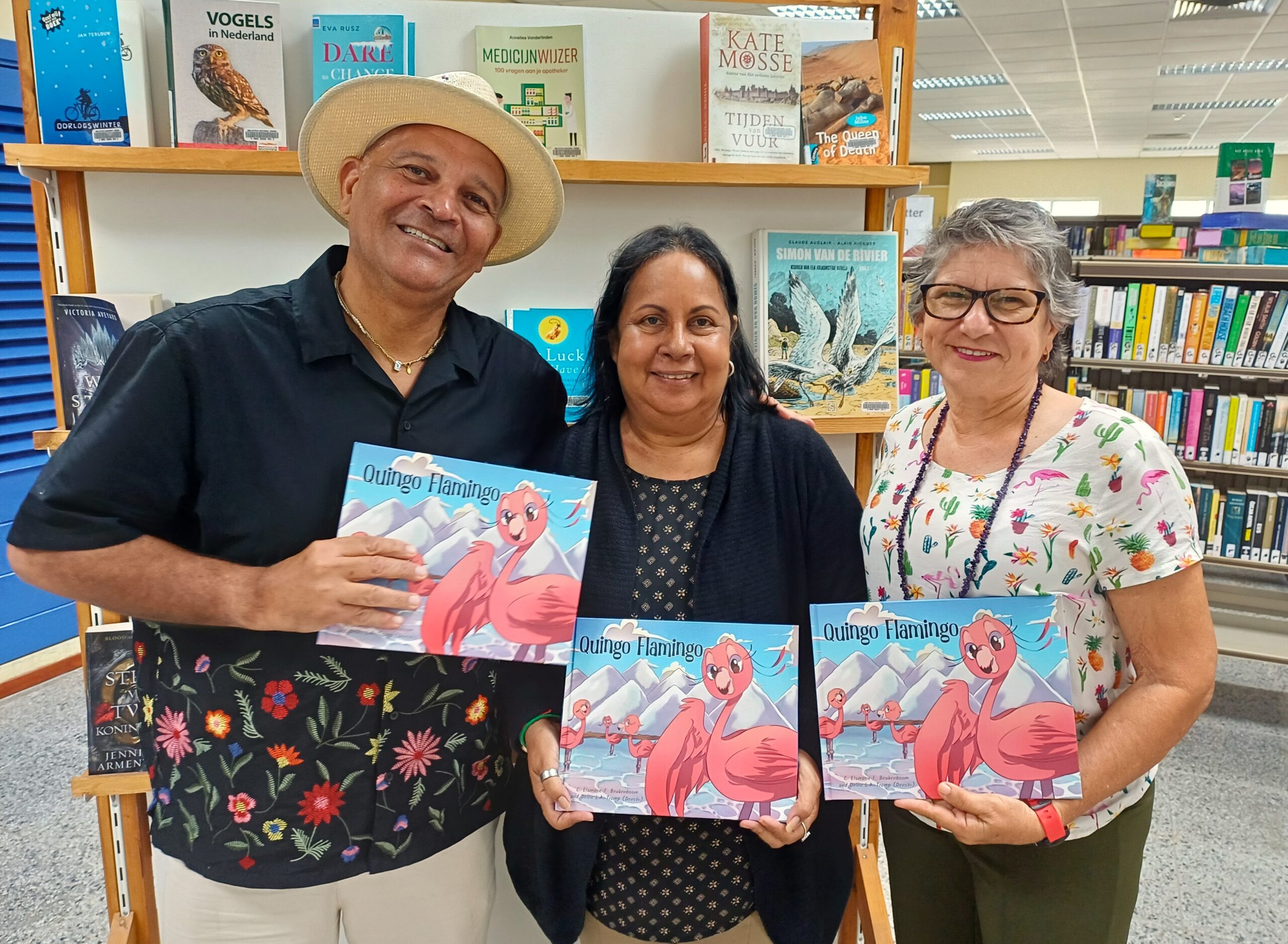 Esaki ta un buki na tres idioma, Papiamentu, Hulandes y Ingles. Corry Elsmarie Frederica Beukenboom y Delno l.A. Tromp a pone forsa hunto pa skirbi e buki pa mucha ‘Quingo Flamingo’. Inspira pa nan propio experencianan como isleño, hunto nan a crea e historia colorido y significante aki. Y ya nan ta pensando pa produci mas buki mucha. Escritornan Elsmarie Beukenboom y Delno (Denchi) Tromp a presenta nan buki nobo na hefe suplente di Biblioteca Nacional Aruba, sra. Lilian Semeleer, titula ‘Qingo Flamingo, un publicacion cu ta promove lectura y cultura local di Boneiro.