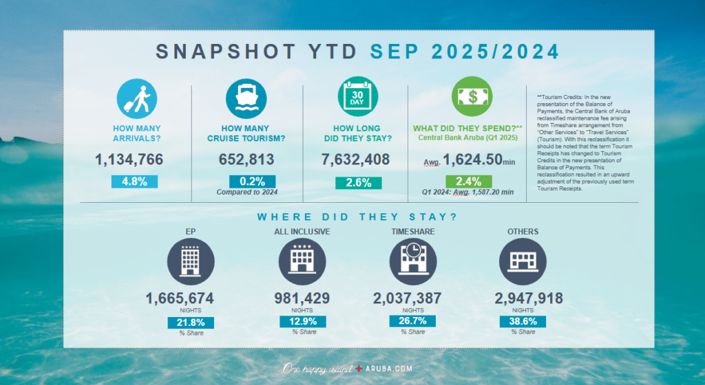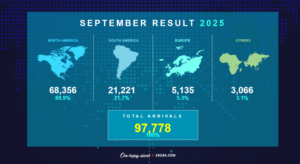 Durante september 2025, Aruba a ricibi un total di 97,778 turista stay-over, representando un crecemento di 2.6% compara cu september 2024. Esaki ta un aumento absoluto di 2,493 bishitante. E aumento mas notabel a bini for di mercado Latino Americano, particularmente Argentina cu un crecemento di 239.6% y Brasil cu 72.8%. For di Norte America, Canada a logra un crecemento fuerte di 14.7%.