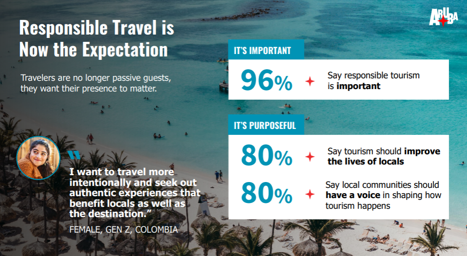 Segun e “Responsible Tourism Impact Report” publica den e rapport mensual di A.T.A. pa e luna di september 2025, 96% di biaheronan mundial ta mira e importancia di turismo responsabel. 80% ta kere cu turismo mester mehora bida di comunidad local, mientras 73% ta expresa deseo pa laga un impacto positivo durante nan biahe. Mester menciona cu solamente 23% ta sinti cu nan a haya suficiente guia di industria pa logra esaki.
