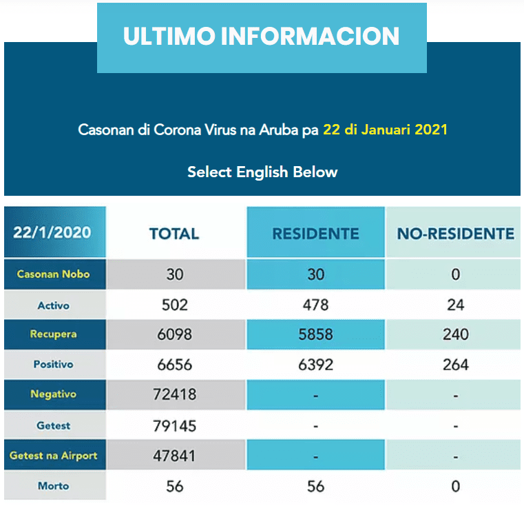 Segun resumen di diabierna, 85 persona a recupera, a registra un total di 30 caso nobo di Covid-19, di cual tur ta residente. Cantidad total di testnan ehecuta ayera na e diferente localidadnan na Aruba, entre otro laboratorio di hospital, laboratorionan priva y aeropuerto ta 560 test. ‘Postivity rate’ entre nos residentenan ta 13%.