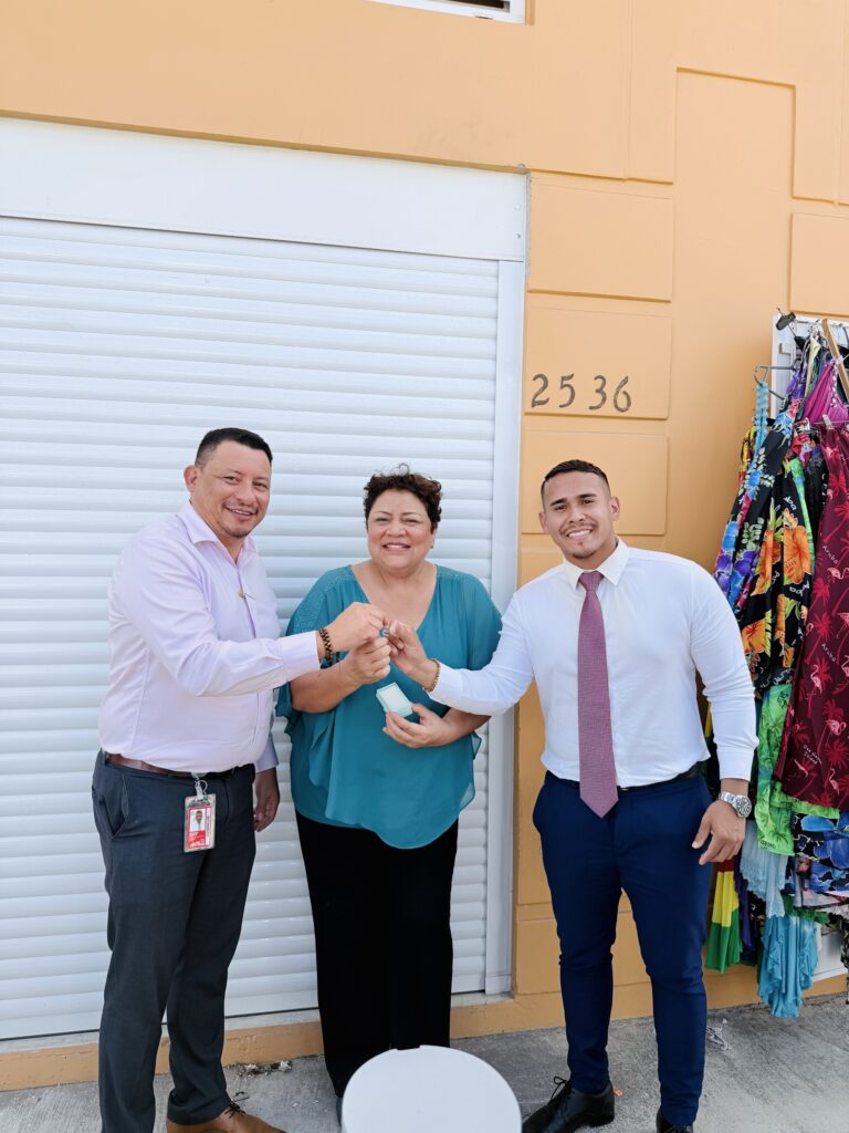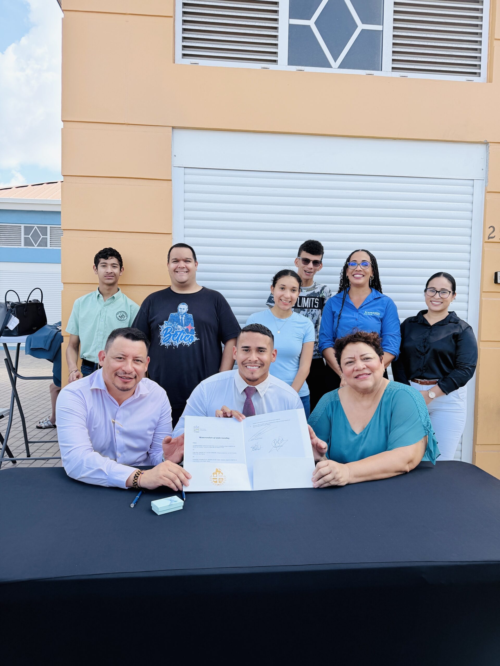 Diaranson mainta, Minister di Turismo, Labor y Transporte mr. Wendrick Cicilia, CEO di Aruba Ports Authority, Marc Figaroa y Caroll Kock di Trampolin pa Trabao a firma un MoU pa brinda un sosten financiero na Trampolin pa Trabao y alabes a entrega un kiosco situa na Welcome Plaza pa asina e hobennan por participa productivamente den nos comunidad.