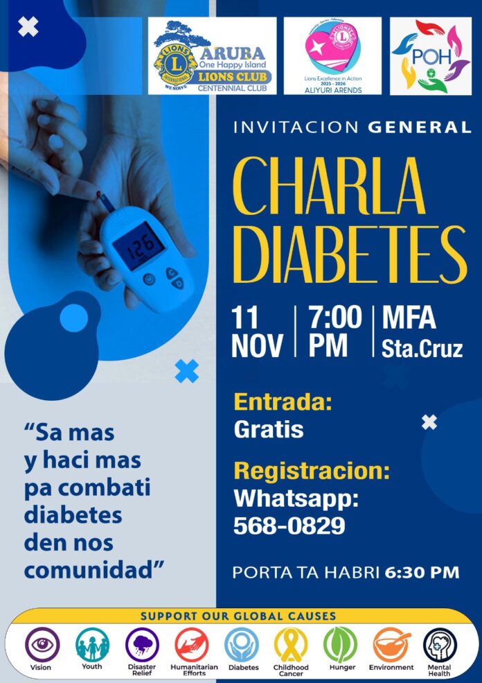 Aruba One Happy Island Lions Club ta recorda comunidad cu e Charla di Diabetes lo tuma luga mayanan diamars, 11 di november 2025, 7:00 PM na MFA Santa Cruz.