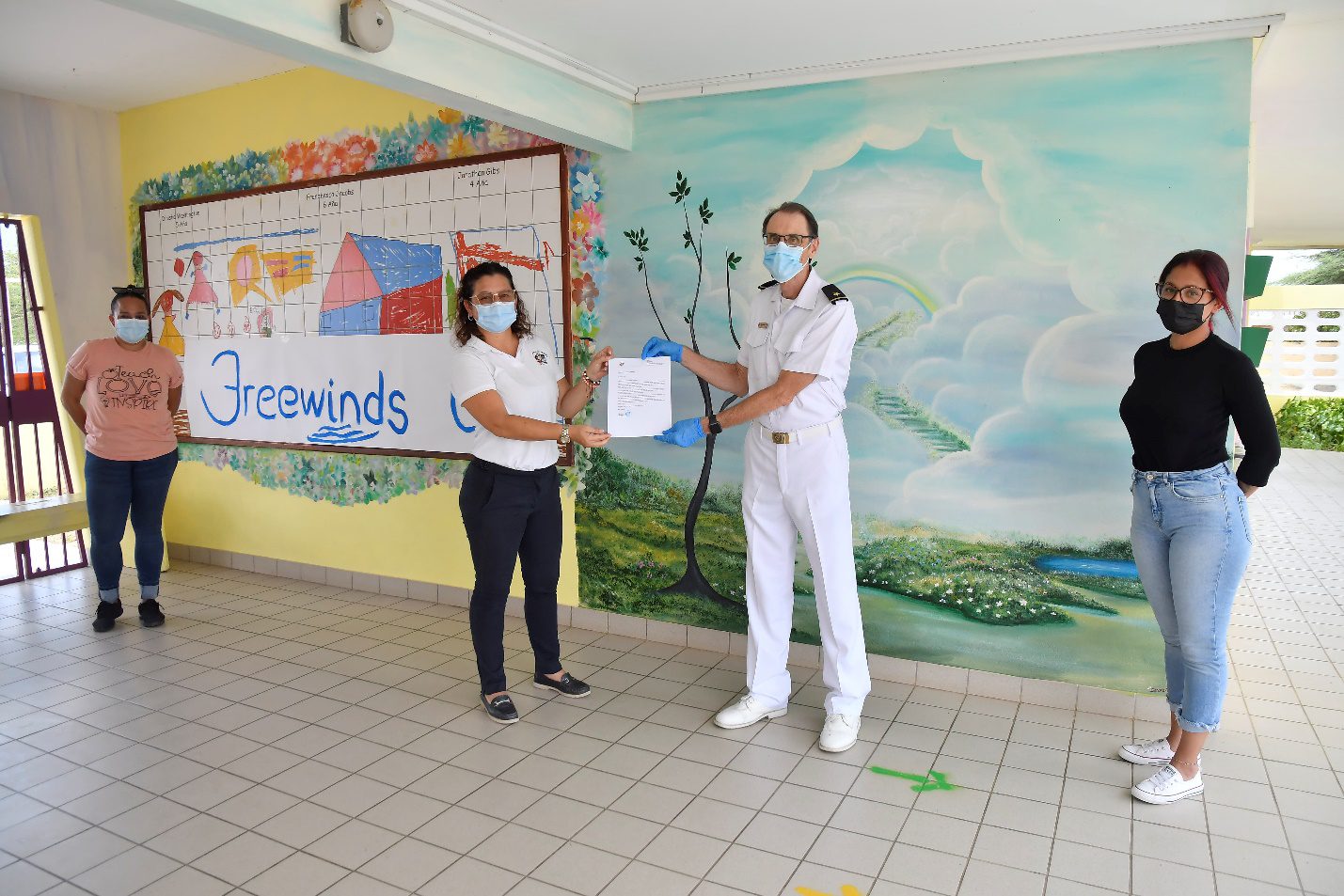 E cabesante di e scol, sra. Angela Romero. Hunto cu e staf, a presenta na e Port Captain di Freewinds un carta di gradicimento pa mustra nan aprecio di e scol pa e asistencia duna durante e ultimo diesdos luna. Pa a mantene e alumnonan y e staf sigur dor di desinfecta regularmente cu D7, e agente mas efectivo di mata virus y bacteria riba mercado awendia.