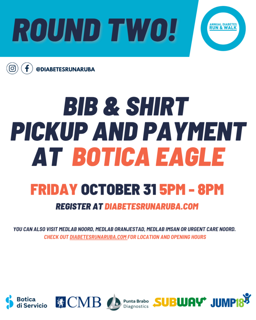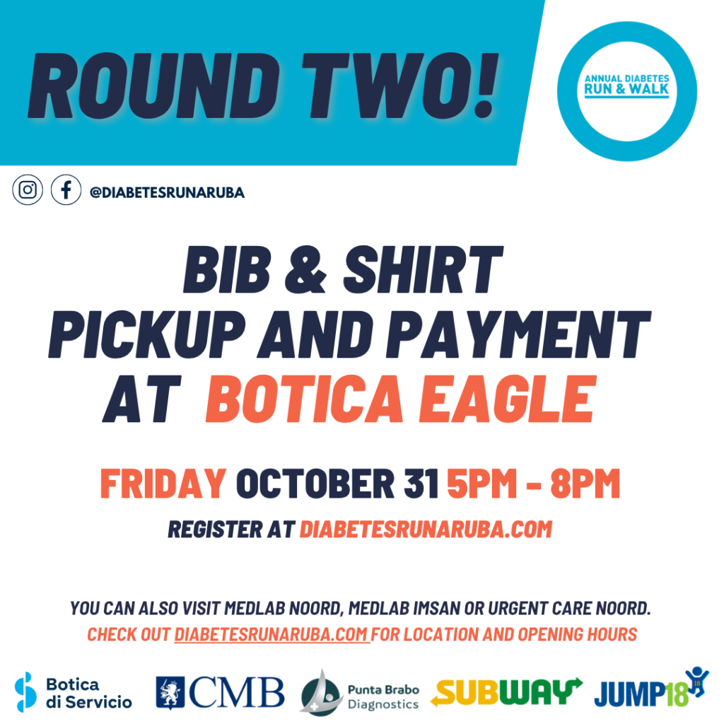 Botica Eagle ta recibiendo comunidad di Aruba pa un di dos biaha diabierna, 31 di october entre 5pm y 8pm pa asina busca shirt y BIB pa e di 8 edicion di Diabetes Run & Walk 2025.
