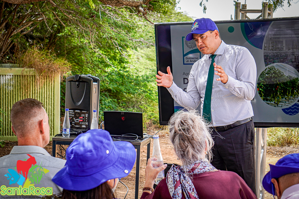 A admira matanan di fruta y berdura cu tin planta y tambe haya un splicación di e tipo di Bacanan cu nos tin y nan rasa. Asina e recorido na pia a continua caminda a yega na e seccion caminda tin planea e Agri Innovation Park (AIP) lo mester bin. A tuma un momento di descanso y asina sr. van Marum haya un presentacion corto di minister sr. Geoffrey Wever y sr. Erwin Greoneveld di kico lo bai bira e proyecto enkeustion. Tur presenta na e occasion aki a ricibi algo pa refresca cu ta un tremendo juice di lamunchi prepara y tambe un drigidek como pasaboca. E recorido a continua despues pa e DC ALFA Food Forrest caminda tambe a haya un splicacion encorto di kico tabata e idea y pa ilustra otro sistema sustenibel cu nos ta studiando pa local ta su contribucion commercial. Pa culmina e paseo den Santa Rosa a yega na “Cunuco Chabelito” cu ta nos “Kinderboerderij” caminda varios di nos productornan local tabata anfitrion. Aki e Staatssecretaris sr. Eddie van Marum a bishita cada un di nos productornan local invita pa asina serca conoci cu nan y admira kico ta e productonan cu nan ta produci y ofrece na e pueblo di Aruba. Asina a haya un splicacion cortico di cada productor presente. Por a admira sra. Rachelle Peterson kende ta produci varios tipo di Mushroom. sr. Jair Britten di “Cunuco Calbas” kende ta un productor di carni fresco, Brandon Maduro y Angelique Croeze di “Croeze Farm” cu su variedad di berdura. Sra. Shirley Illidge cu ta produci varios liquer, esnan di Pestana Ranch cu nan produccion di Webo Fresco, sr. Jake Arends di “Cunuco Fresh” cu ta produci lechuga fresco, sr. Daniel Barros kende ta un apicultor y ta produci honing y otro productonan, sr. Charles Koolman kende ta un productor di pinda masha popular y na final tabata sr. Ivan Dijkhof di “Sunny Greens cu ta produci varios Micro Greens.