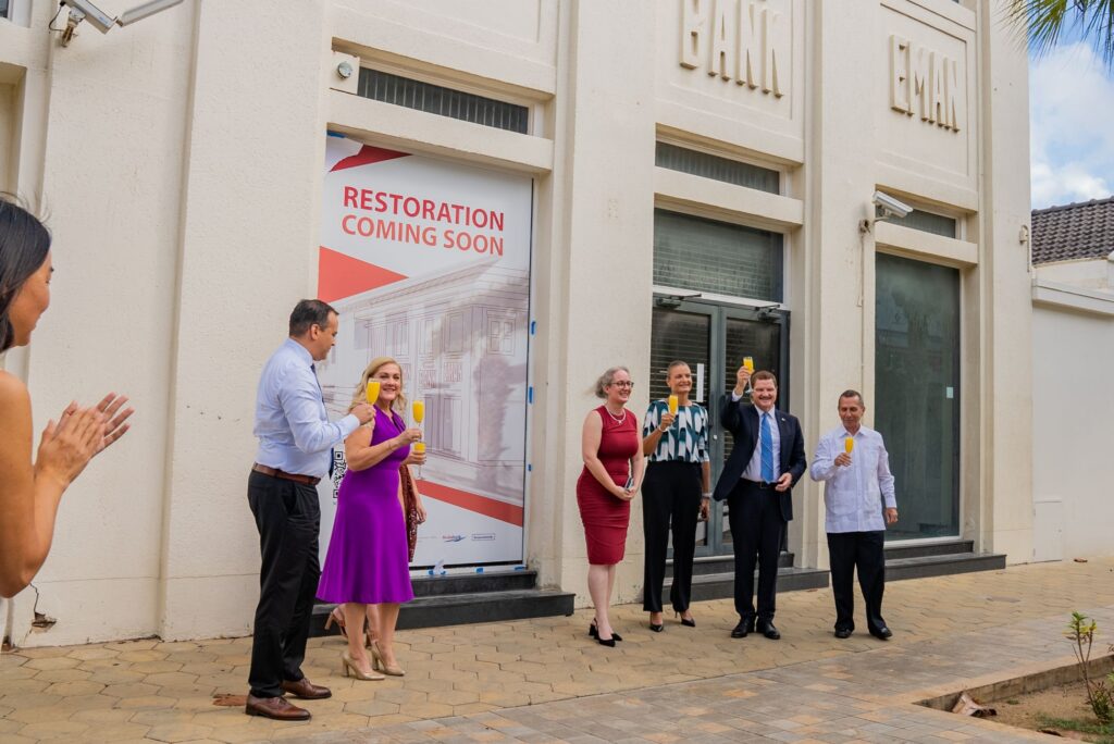 Dialuna dia 29 di december 2025, a tuma luga e traspaso oficial di e edificio historico “John G. Eman”, un structura emblematico localisa na Caya G.F. Betico Croes 41 cu ta inicio di e historia di Aruba Bank (antes John G. Eman Bank). E evento ta marca un momento crucial den e esfuersonan pa conserva y restaura e patrimonio arkitecnonico di Oranjestad pa e generacionnan futuro.