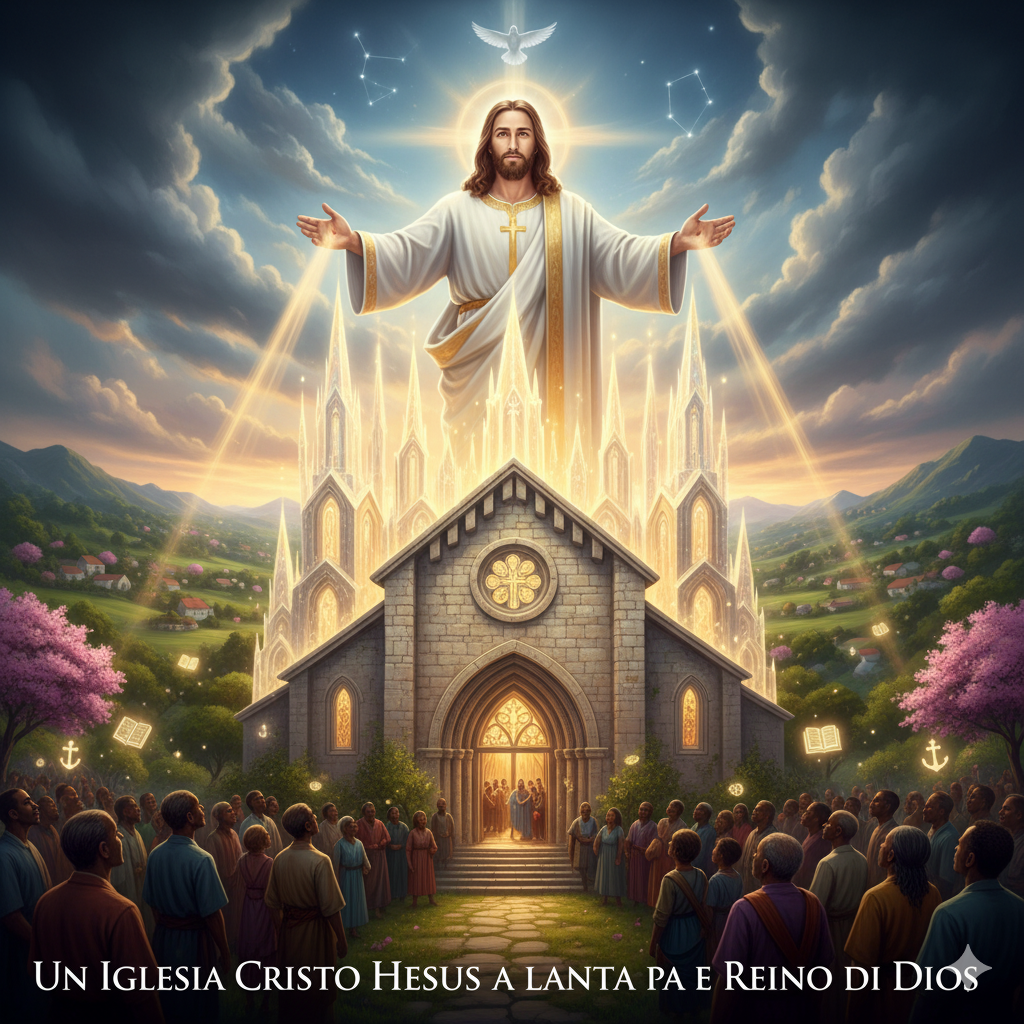 Bijbel Exodo 24: 7- 8, den e Evangelio aki, Dios Tata a cera e prome Aliansa cu e pueblo di Israel, pa medio di Moises. Bijbel 2 Samuel 7: 16, den e Evangelio aki, Dios Tata a eligi David, pa bira e prome Rey di Israel. Dios Tata a priminti Rey David cu su sucesornan,cu nan lo ta pa semper encabesa e Reino di Dios. Bijbel Mateo 26: 26 – 28, den e ultima cena Hesus a bisa Su apostelnan: “Boso tur bebe for di e copa di binja aki, esaki ta Mi Sanger, e Sanger cu ta confirma e Aliansa cu Mi ta derama pa hopi hende, pa pordon di pikanan.” Akinan Hesus ta confirma Su Sacrificio y morto na crus, deramando Su Sanger precioso, pa e Aliansa Nobo di Dios Tata, cu ta e Herusalem Nobo di Israel. Bijbel Lucas 1: 32 – 33, ta bisa: “Senjor Dios lo duna Hesus e trono di Su antepasado Rey David y te den eternidad lo E ta Rey di e descendientenan di Jacob y Su Reino lo no tin fin.” Bijbel Mateo 16: 15 – 19: “Hesus a puntra Su apostelnan: Anto boso mes, ta ken boso ta bisa Mi ta? Simon a contesta: Bo ta E Mesias, E Yiu di Dios bibo! Hesus a bis’e: Felis bo ta Simon yiu di Huan, pasobra no ta hende a revela bo esaki, ma Mi Tata cu ta den Cielo. Mi ta bisa bo: Abo ta Pedro (o sea baranca) y riba es baranca aki, lo Mi lanta Mi Iglesia y forsanan di fierno lo no podera di dj’e. Lo Mi duna bo e yabinan di Reino di Cielo y loke bo prohibi na tera, ta prohibi den Cielo tambe y loke bo permiti na tera, lo ta permiti den Cielo tambe.” Akinan Hesus ta bisa bon cla, Mi Iglesia, osea un solo Iglesia y no Iglesianan. E demonionan den fierno lo lanta diferente sectanan na mundo, pa podera y pa kibra e Iglesia di Hesus, pero nan lo no logra. Hesus a duna Simon e nomber Pedro, cu ta significa baranca, cabes visibel di Su Iglesia. Hesus a duna Pedro e yabinan di Reino di Cielo y esaki ta significa, cera y habri e portanan di Reino pa laga e almanan drenta den Reino di Cielo. Hesus a duna e autoridad na Pedro pa dirigi Su Iglesia, di loke ta permiti y di loke ta prohibi. Bijbel Marco 16: 15 – 16, aki Hesus ta bisa Su apostelnan: “Sali pasa na henter mundo y predica e Evangelio pa henter humanidad.” E palabra, sali pasa na henter mundo y predica e Evangelio pa henter humanidad, ta significa, Universal, Hesus Su Iglesia ta Universal. E Iglesia Universal di Hesus, ta e pueblo Nobo di Israel di Dios Tata. Comprende awor, cu tur hendenan, sectanan y e Hudiunan mes, nan mester kere den Cristo-Hesus y nan mester drenta y bautisa den E Iglesia Universal di Hesus, pa nan por drenta den e Reino di Cielo. Hesus a institui, Su doctrinanan di Gracianan di salbacion pa Su Iglesia: Bautismo Mateo 28: 19 – 20, Confirmacion Echonan di Apostelnan 2: 1 – 4, Confesion Huan 20: 23, Eucaristia Lucas 22: 19 – 29, Matrimonio Mateo 19: 4 – 6, Apostolado Marco 3: 13 – 19, Enfermonan Hacobo 5: 14 – 15. Awor puntra bo mes, ta di con tin tanto sectanan na mundo y mientras ta un Iglesia Hesus a lanta? Na anja 1521, Martin Luthero un frere, teologo aleman a bai contra di e Iglesia Universal di Cristo-Hesus. El a inventa e theoria di e interpretacion liber di Bijbel. E interpretacion liber aki, a produci 36.000 diferente sectanan y oposicionnan na mundo. Tur e sectanan aki, ta pretende di ta di Hesus. Durante tempo, nan a trece hopi division y hopi di nan a lanta nan mesun religionnan, sectanan y predicando e Bijbel den nan mesun manera y buscando hendenan debil den fe pa sigi nan tras. Martin Luthero ta un Protestant, pasobra el a protesta contra Iglesia y el a trece doctrinanan robes den e Iglesia Universal di Cristo Hesus. Den Bijbel Echonan Apostelnan 20: 28 – 30, carta di San Pablo na su coleganan Apostelnan ta bisa: “Cuida boso y di henter e rebanjo na cual Spirito Santo a pone boso como Obisponan pa warda e Iglesia di Senjor, na cual E’l a gana cu Su propio Sanger. Mi sabi cu despues di mi partida, lo drenta lobonan feros cu lo no tene compasion cu e rebanjonan y cu denter di boso mes, lo surgi hendenan cu lo sinja doctrinanan robes y nan lo gana discipelnan nan tras.” Ta manera cu Hesus a bisa den Bijbel Mateo 16: 18, cu forsanan di fierno lo purba podera y kibra e Unico Iglesia Universal di Hesus, pero nan lo no logra. Den Bijbel Revelacion 21: 10-14, ta papia, di e ciudad Santo di Herusalem cu tabata bahando di Dios for di Cielo, briyando di Dios Su Gloria. E muraya di e ciudad tabata tin diesdos piedra di fundeshi grandi y riba nan, e diesdos nomber di e diesdos Apostelnan di E Lamchi tabata scirbi. Esaki ta e diesdos nombernan di e Apostelnan scirbi riba e diesdos Portanan di Reino di Cielo. E Herusalem Nobo di Dios Tata, ta e Aliansa Nobo di Israel pa medio di Cristo Hesus y e Aliansa Nobo aki, ta e Unico Iglesia Universal di Cristo-Hesus pa e Reino di Dios. Nos tambe den Iglesia ta den e Herusalem Nobo di Israel di Dios Tata. Ta manera den Bijbel 2 Samuel 7:16  Dios Tata ta bisa, cu e sucesornan di Rey David di Israel, cu nan lo ta pa semper encabesa e Reino di Dios. Husga pa bo mes, bo ta den e Iglesia corecto pa bo salbacion? Nunca no ta laat pa compronde e berdad y pa comberti na tempo.