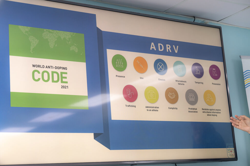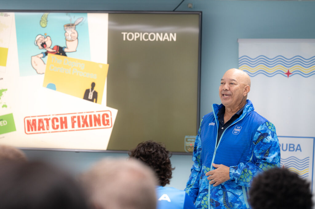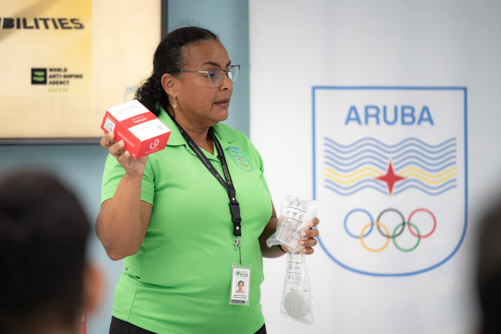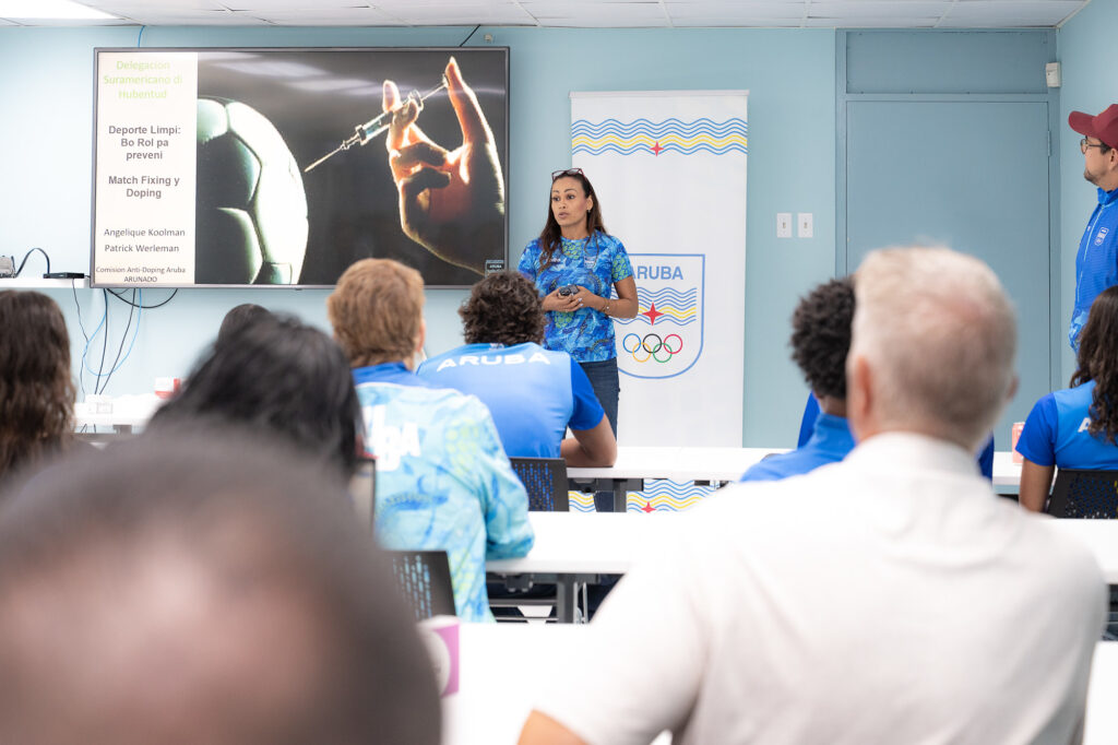 Pa cu anti-doping a conta cu presencia di Patrick Werleman cu ta presidente di e organisacion di ant-doping na Aruba “ARUNADO” y di Angelique Koolman, cu ta un “Doping Control Officer” (DCO) y alabes instructor di tur cos anti-doping pa Aruba y den regionCaribense. Durante e workshop aki a enfoca pa cu e parti di “Doping Test” cu por tuma luga durante e weganan, pa asina tur atleta sa kico ta nan responsabilidad y derechonan. Importante pa menciona ta cu tur miembro di e delegacion di TEAMARU ta haci curso nan di anti-doping online via e plataforma “ADEL” pa asina tin e conocemento di e tema importante aki.