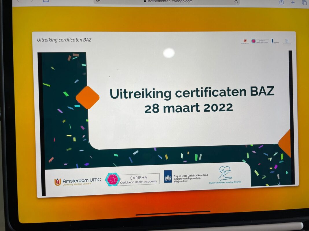 Dialuna 28 di maart Minister di Salubridad Publico Sr. Dangui Oduber tabata presente den un reunion virtual. Esaki a sosode conhuntamente cu e Staatssecretaris van Volksgezondheid, Welzijn en Sport di Hulanda (M. van Ooijen) y demas Ministernan di Salubridad Publico di entre otro Corsou (D. Pietersz-Janga) y Sint Maarten (D. Pietersz-Janga). Den esaki un total di 32 enfermera/o di Aruba a ricibi nan Certificado di Basis Acute Zorg (BAZ) di cual 14 ta di HOH y 18 ta di ImSan.