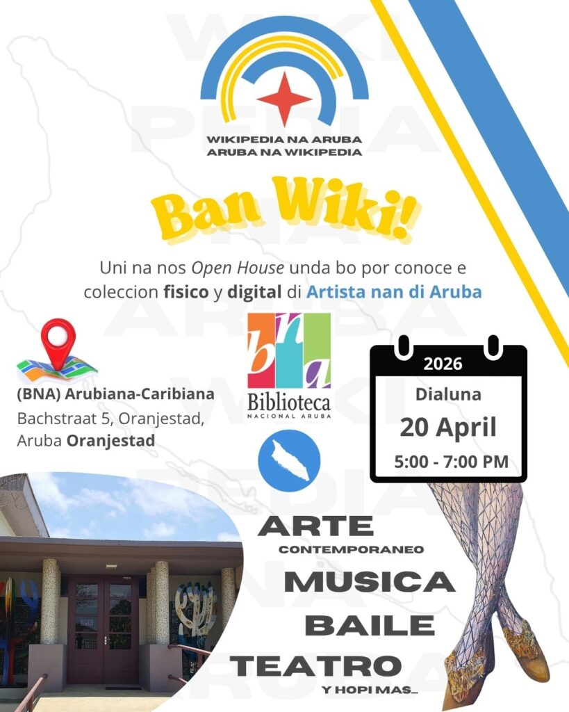 Participacion ta gratis. Lo tin snacks y algo pa refresca. Asina ta usa e oportunidad aki pa trece bo pregunta nan dilanti, conoce e coleccion di Artista nan di Aruba, conecta cu otro boluntario nan y registra pa nos tayernan binidero unda bo lo siña e parti editorial y tecnico di usa Wikipedia.