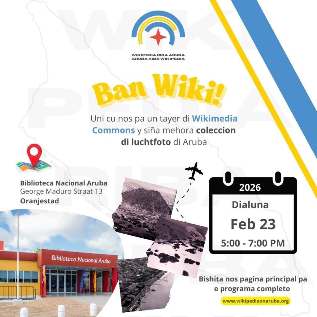 Wikipedia riba Aruba ta invita comunidad di Aruba pa otro encuentro di Ban Wiki! — un espacio habri y amistoso pa colabora, siña y contribui na conocemento habri.