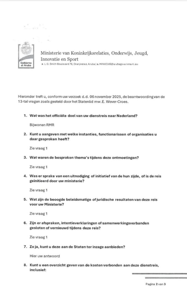 ORANJESTAD – Fraccion di MEP a expresa nan indignacion total despues di a ricibi e contestanan oficial di Minister Gerlien Croes (Futuro) relaciona cu su viahenan pa Hulanda. E documento, cu mester a duna claridad riba gastonan y metanan di e viahe, a keda cataloga como un berguensa pa pueblo debi na e falta di contenido y e evasion constante di e ministernan.